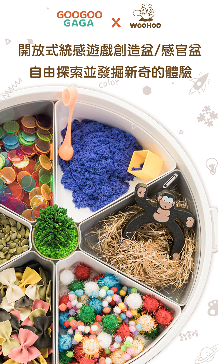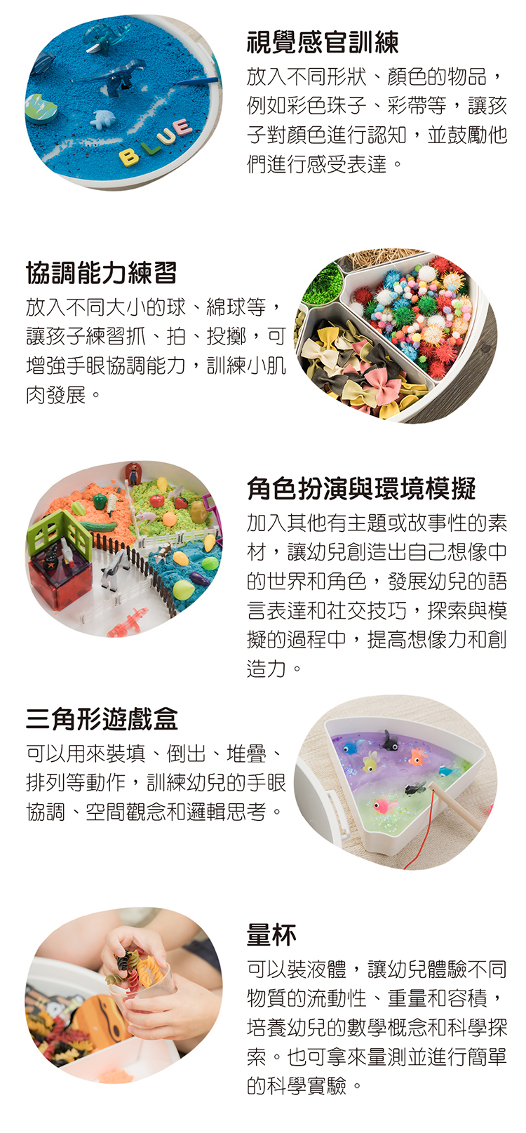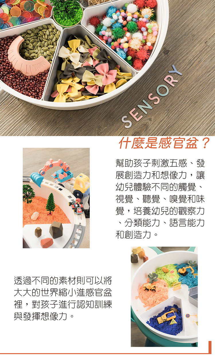 感官盆是一種用於幼兒早期教育的開放式教玩具,透過在感官盆內放入各種不同材質的素材,讓幼兒自由地進行探索和遊戲,刺激幼兒的五感發育和創造力、想像力。感官盆可以模擬出真實世界的情境,根據季節、節日、主題等變化內容物,增加幼兒的興趣和學習效果,讓幼兒在玩樂中學習。