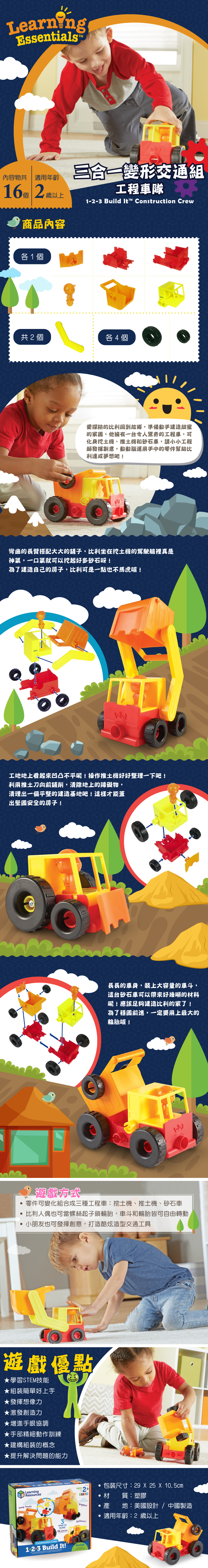 ●16個零件可組合成三種交通工具─挖土機、推土機、砂石車