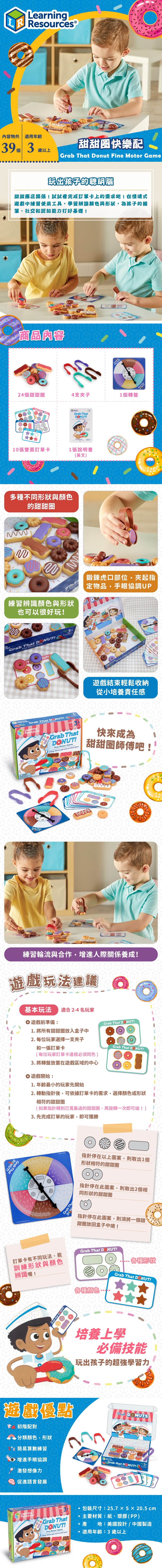 ●24個甜甜圈、4支夾子、1個轉盤、10張雙面訂單卡、1張說明書(英文)