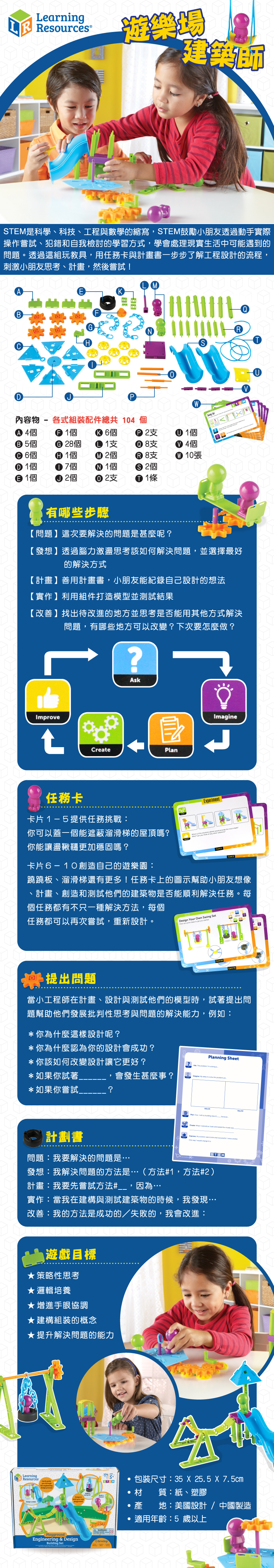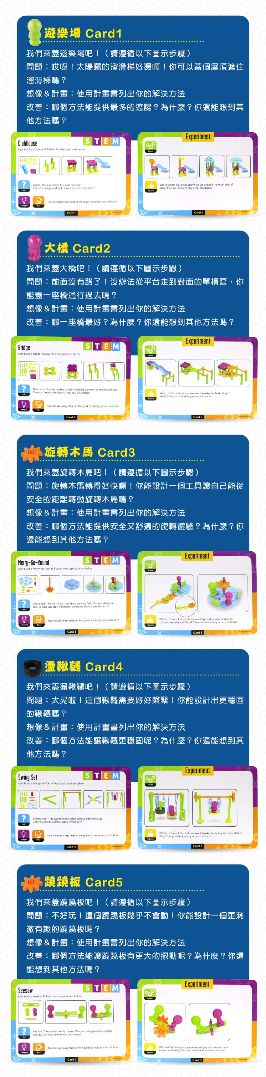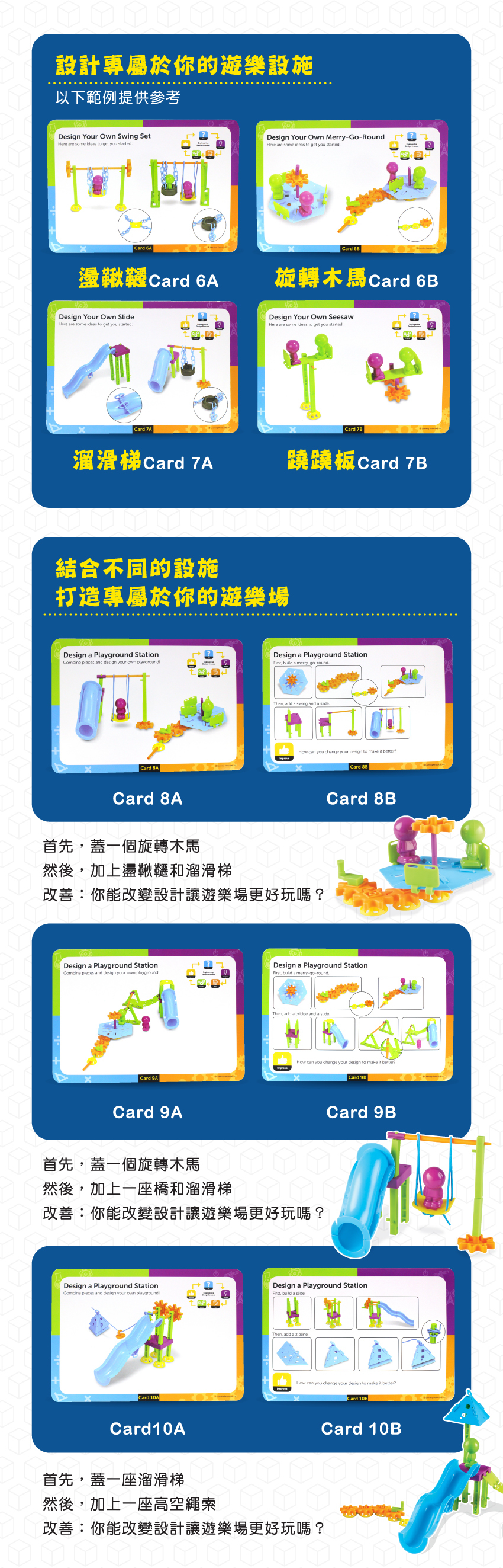 ●共94個零件、10張任務卡,可依任務卡解決問題或建構獨一無二的遊樂園