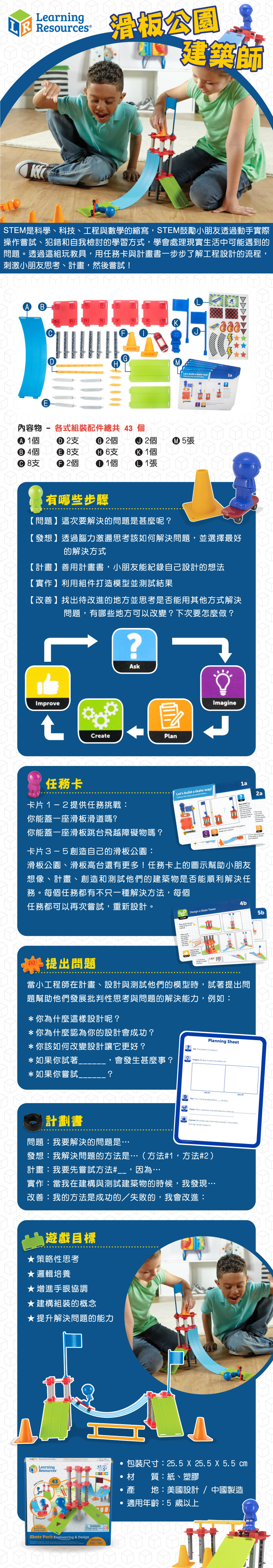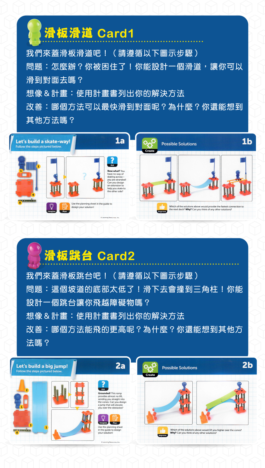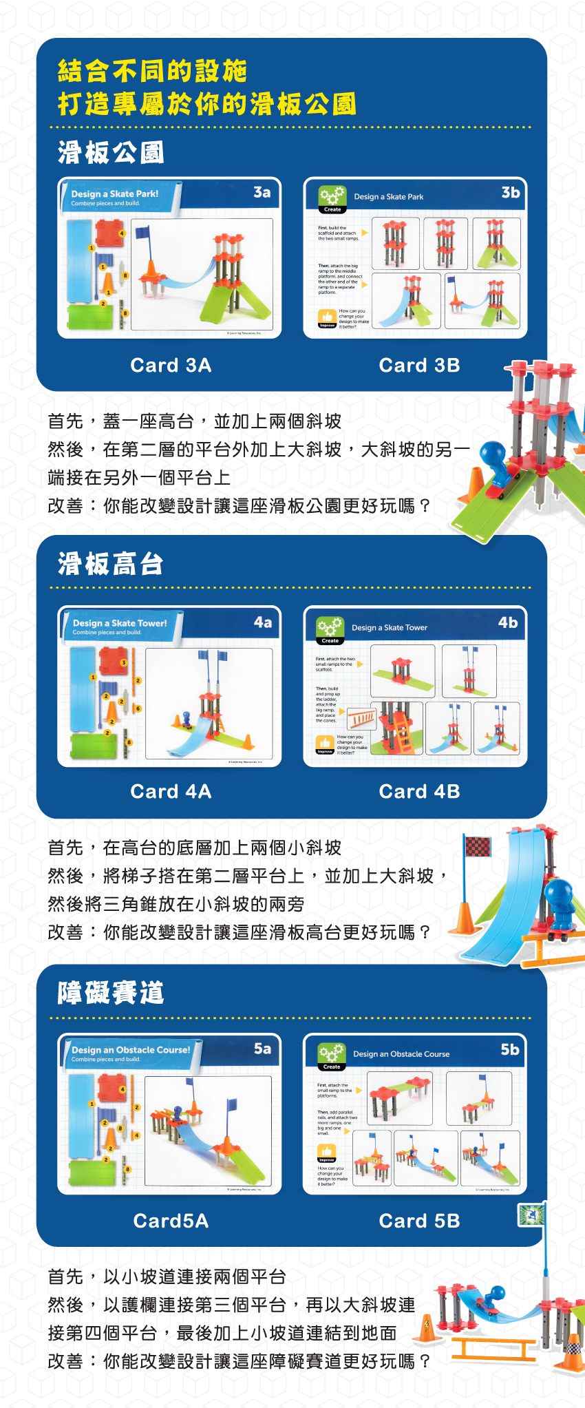●共38個零件、5張任務卡,可依任務卡解決問題或建構獨一無二的滑板公園