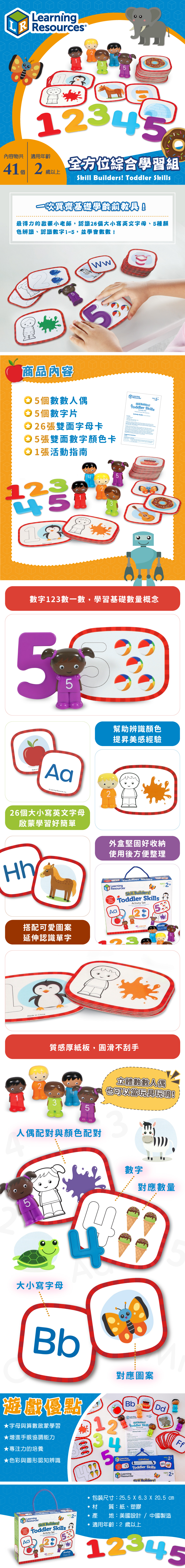 ● 共5個數數人偶,5個數字片,26張雙面字母卡,5張雙面數字顏色卡,1張活動指南
