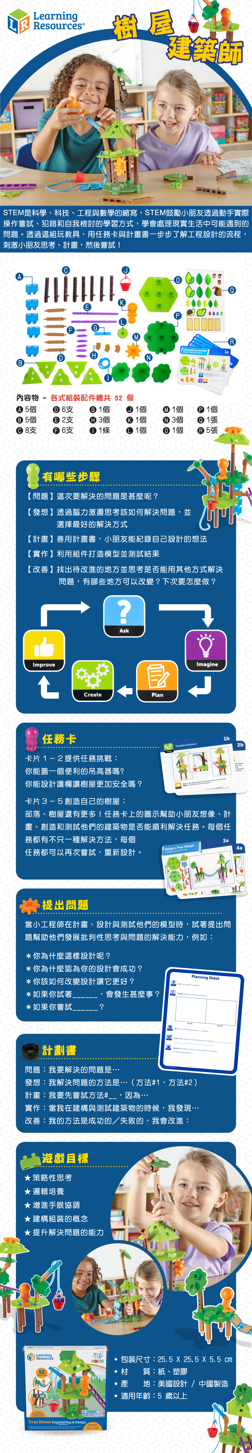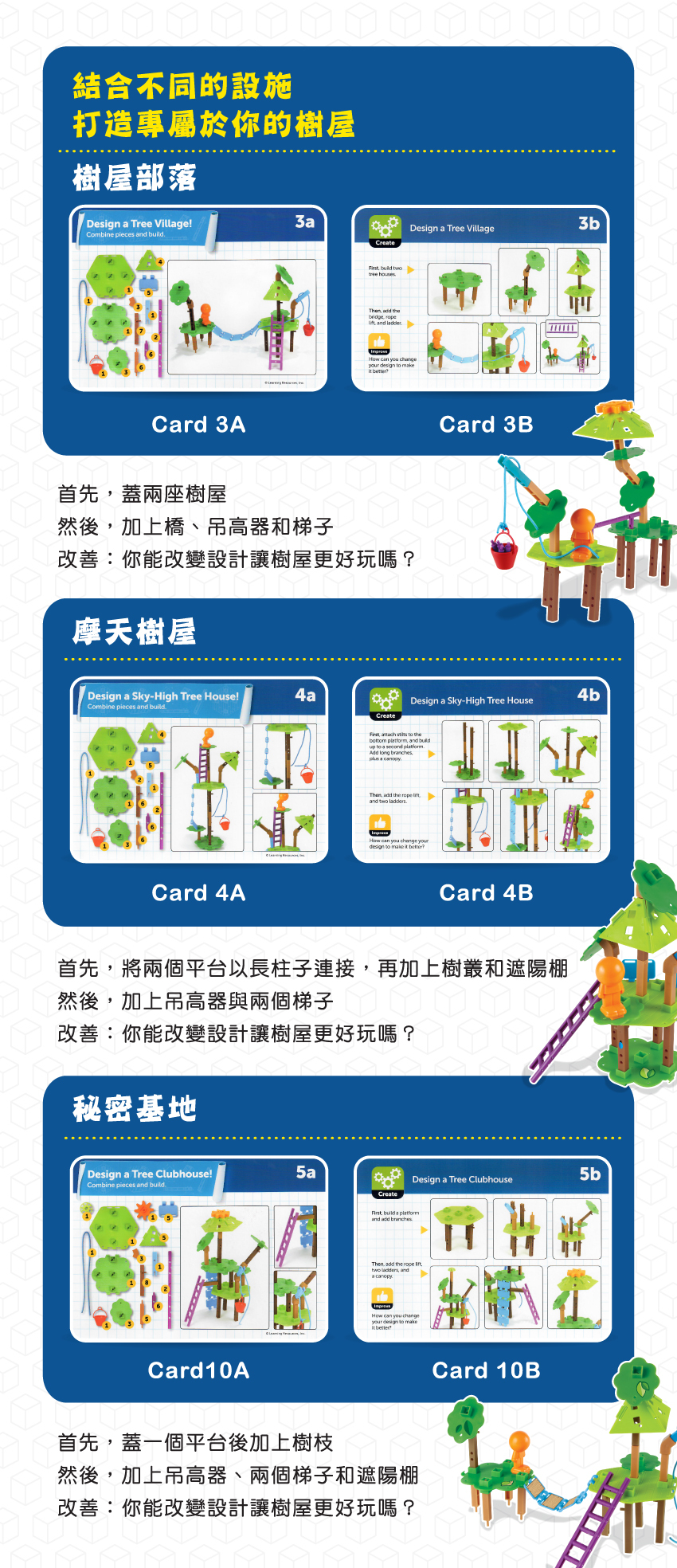 ●共47個零件、5張任務卡,可依任務卡解決問題或建構獨一無二的樹屋