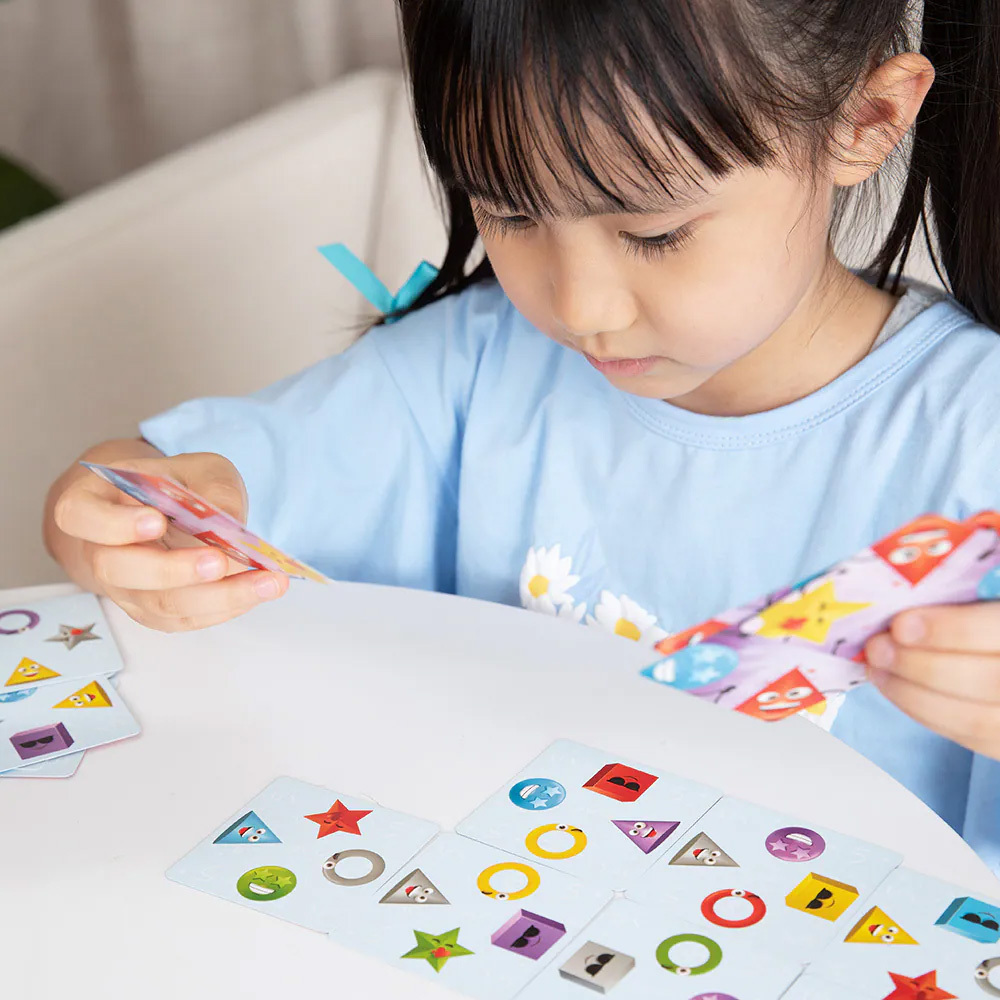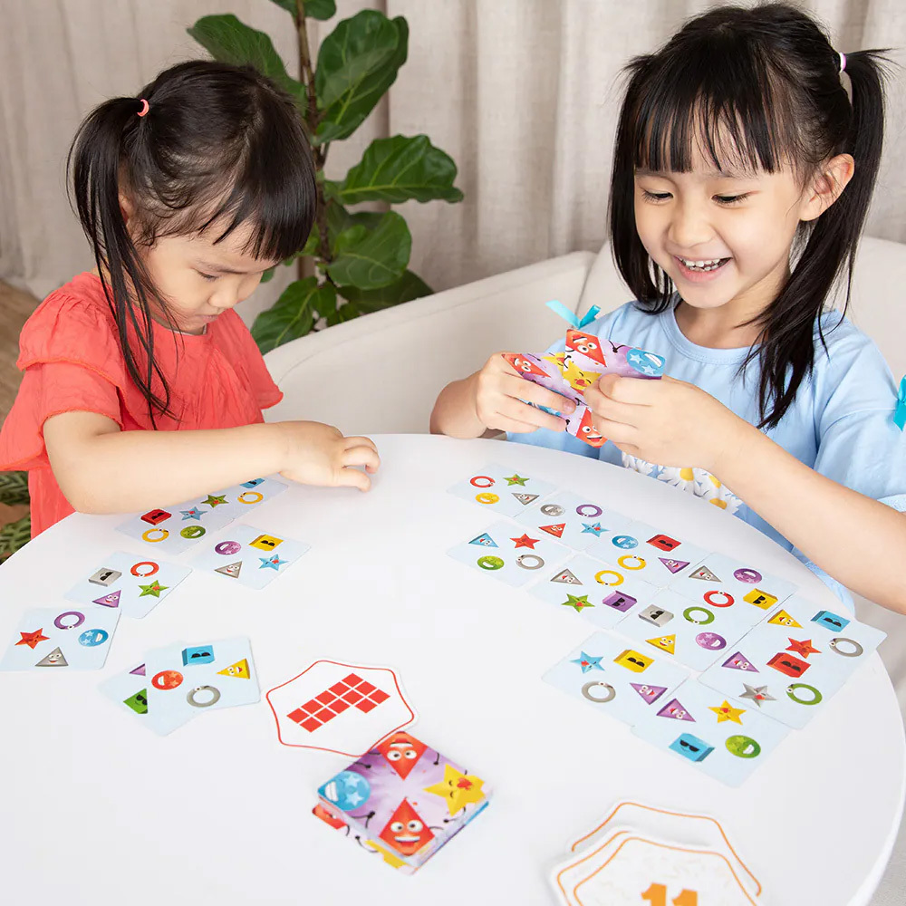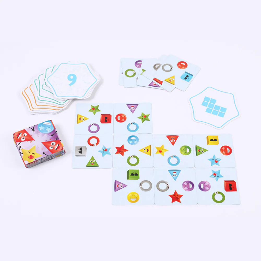 快速配對,挑戰視覺辨識與反應力!對應遊戲牌上的形狀與顏色,觀察形狀相同、顏色相同或形狀 + 顏色相同,快速排出挑戰圖形。速度最快的玩家就可以贏得勝利!