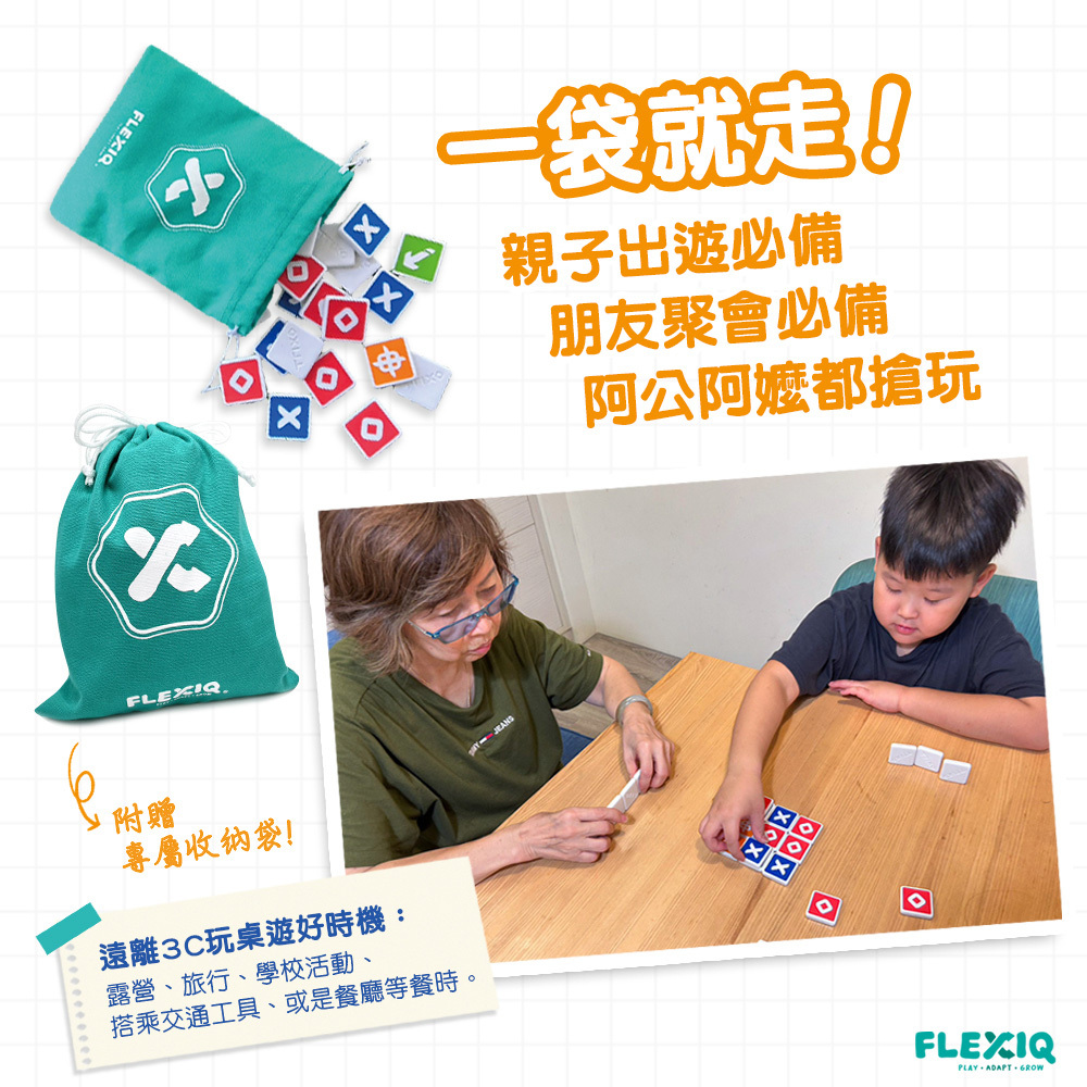 「FlexiQ連線疊對疊」是一款有趣、快節奏、練習攻守技巧的策略遊戲!適合2~4名玩家共玩,遊戲規則非常簡單,有別於傳統的OX遊戲,還加入特殊功能牌,並且跳脫平面將戰場延伸到立體堆疊,玩家們每次完成連線,即可拿走形成連線的牌,以及連線下方的牌堆。促進更多策略思考,想辦法連線獲得最多牌才能贏得高分!適合家人、親子、朋友與祖孫共玩的快速策略遊戲,提升洞察力與戰略思維。