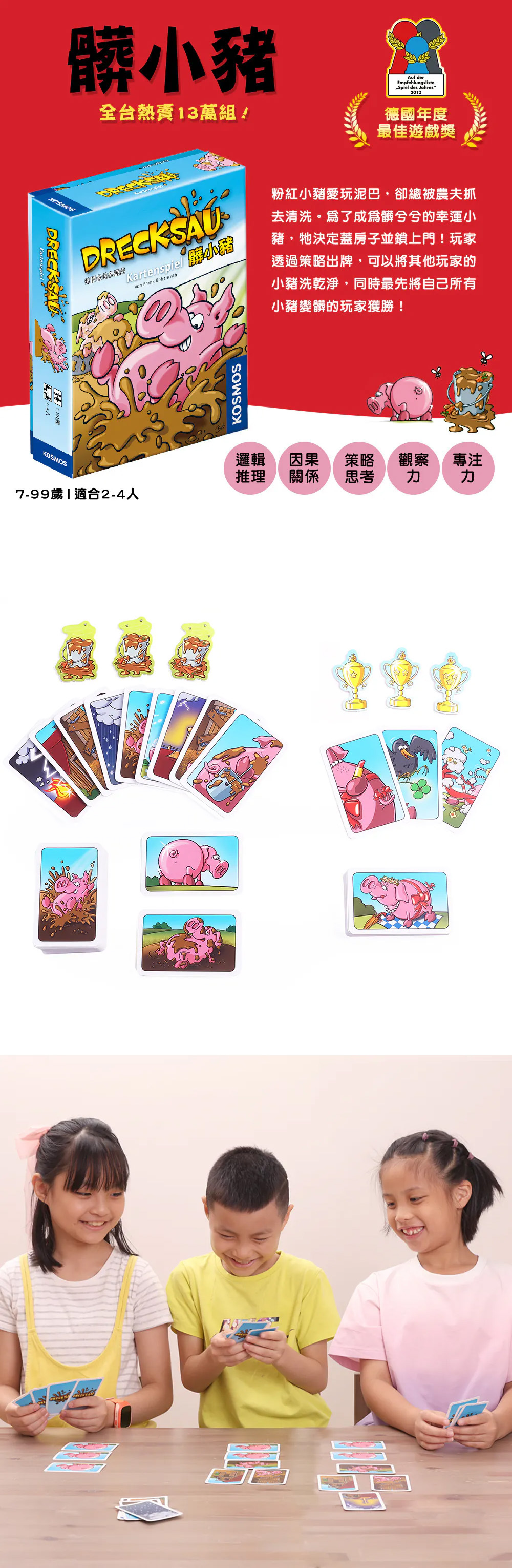 《髒小豬豪華版》結合初階玩法髒小豬與進階玩法小豬選美,並新增2張王牌卡,讓遊戲更加曲折刺激。是要變成滿身泥巴的髒小豬獲得爛泥桶?還是要變成光鮮亮麗的選美豬拿到金盃?小心調整策略,因為遊戲目標隨時在變化!