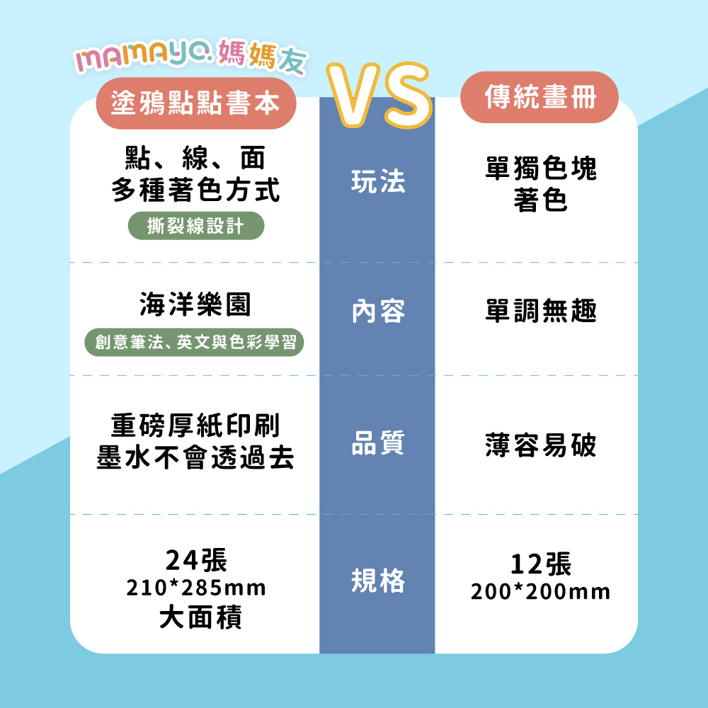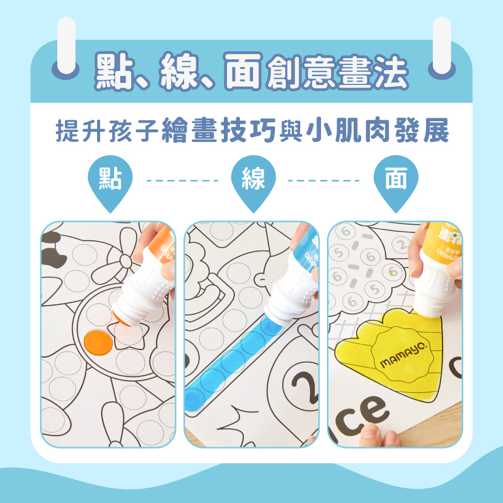 海洋樂園:除了同樣有基礎塗鴉外,更增加基礎運筆筆法的章節、以及數字、英文、混色、拼字等創意內容。