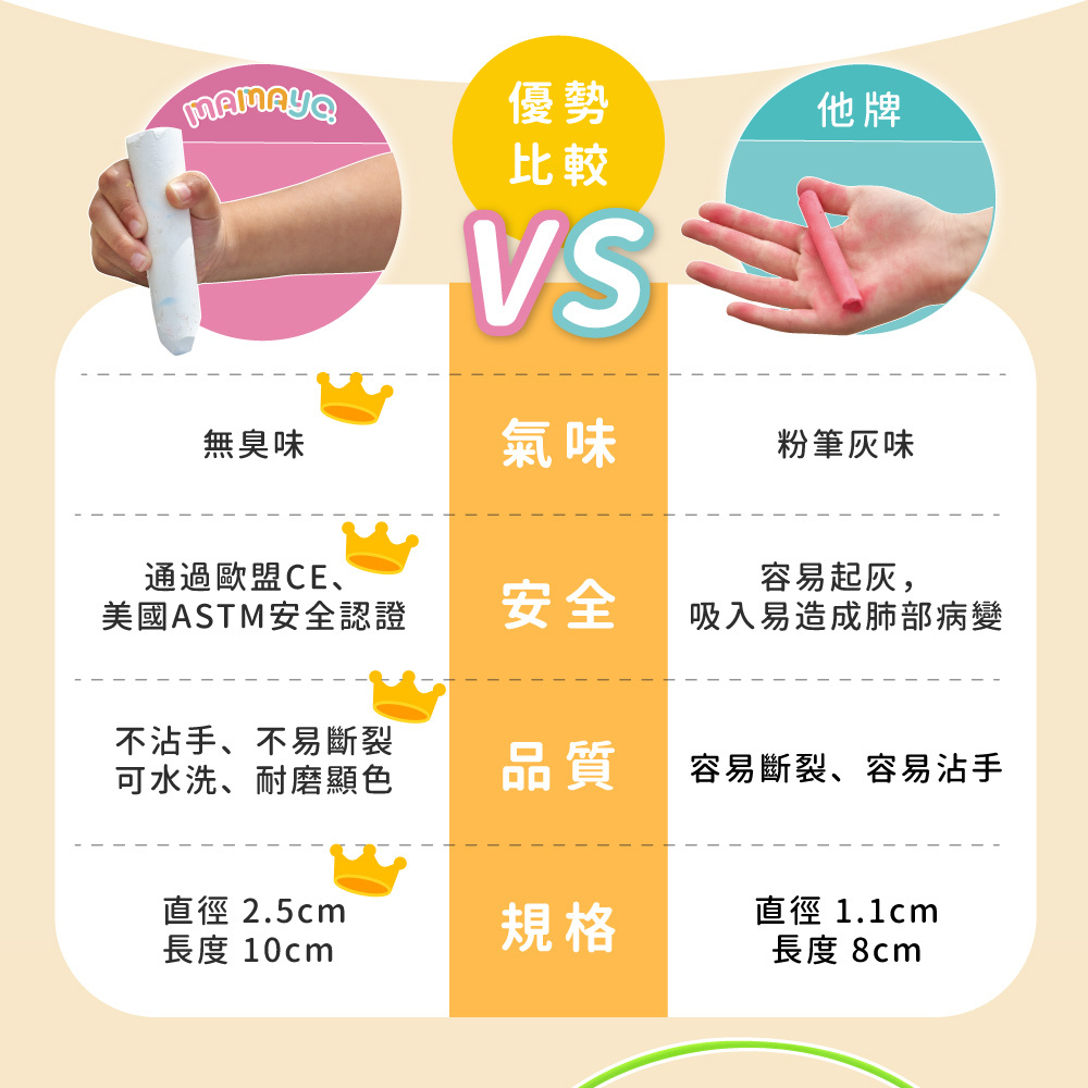 相較於傳統粉筆又脆又容易斷裂,mamayo塗鴉粉筆好抓握好使力,色彩又飽和。