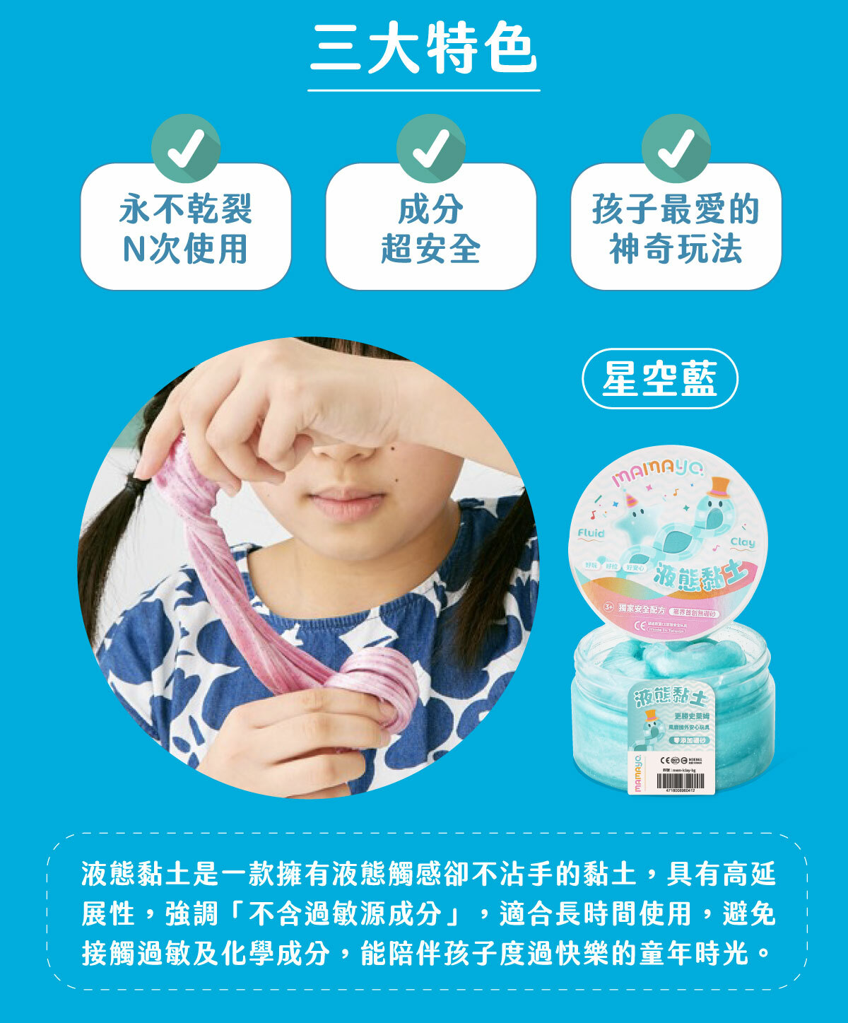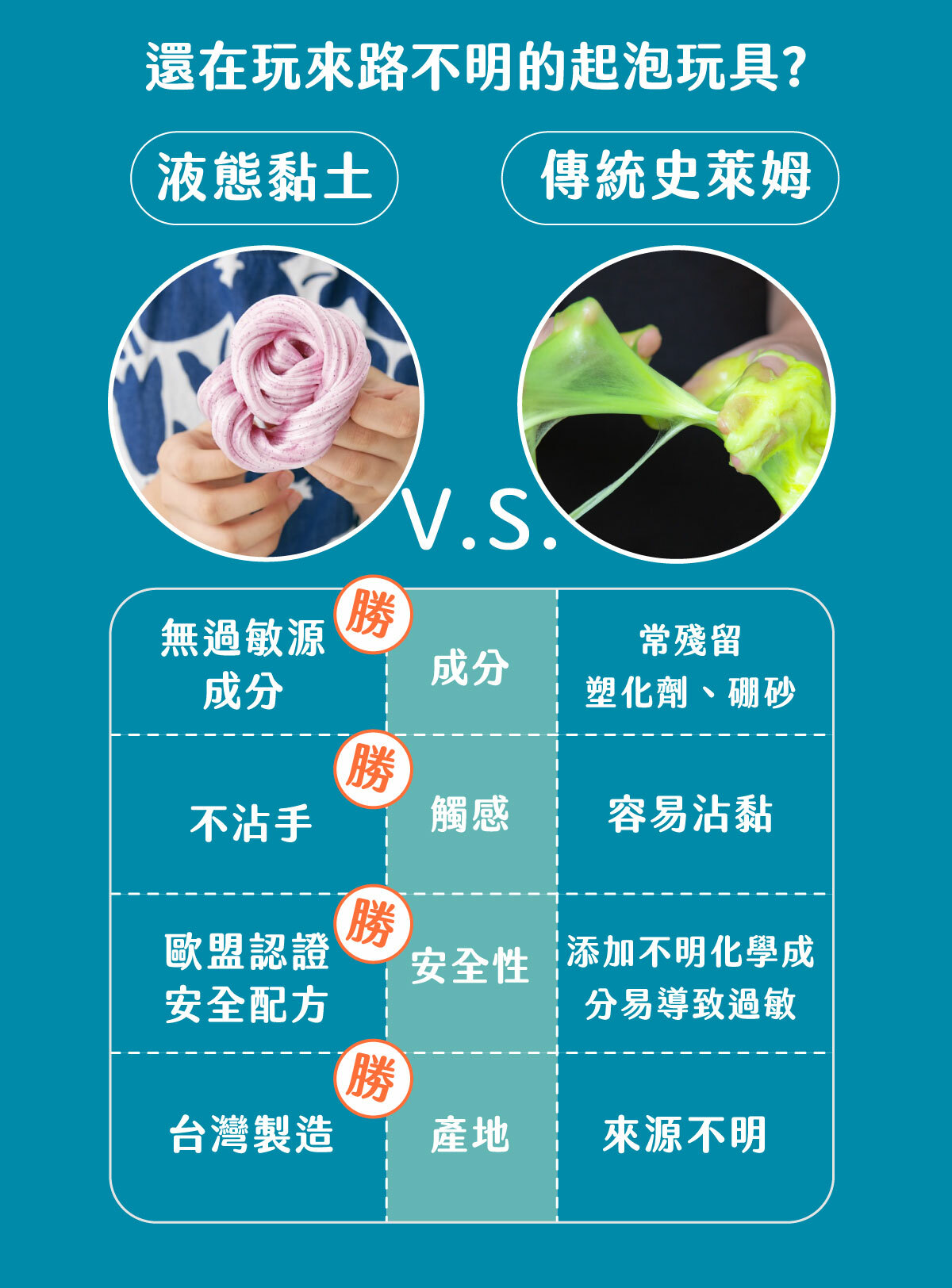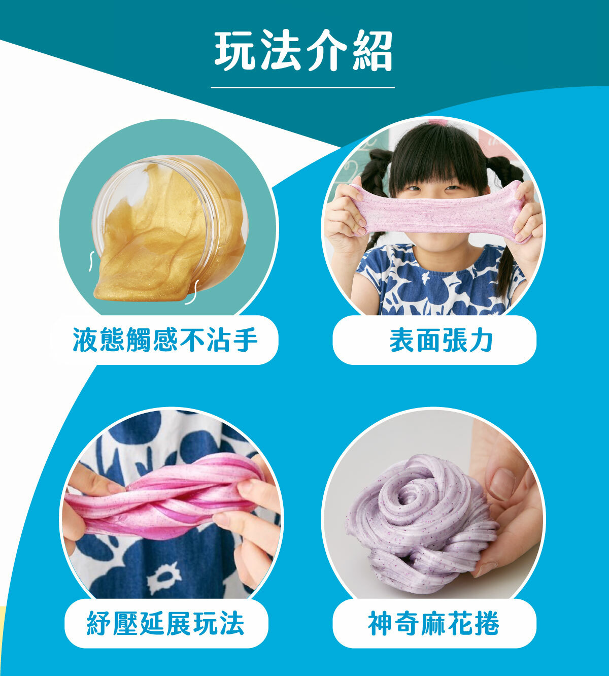 液態黏土本身黏性較強,玩樂時請避開紡織品及橡膠手錶等,避免沾黏之情形