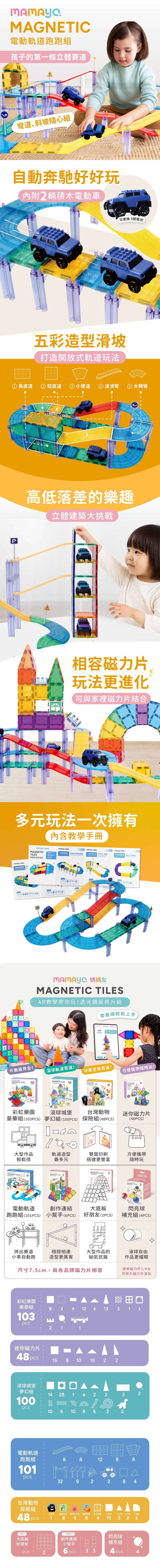 套組內含兩台積木電動車與多款磁力片軌道組件,可變換高低落差、橋樑、隧道等五種滑坡設計。還能連接既有磁力片組,延伸出無限造型。