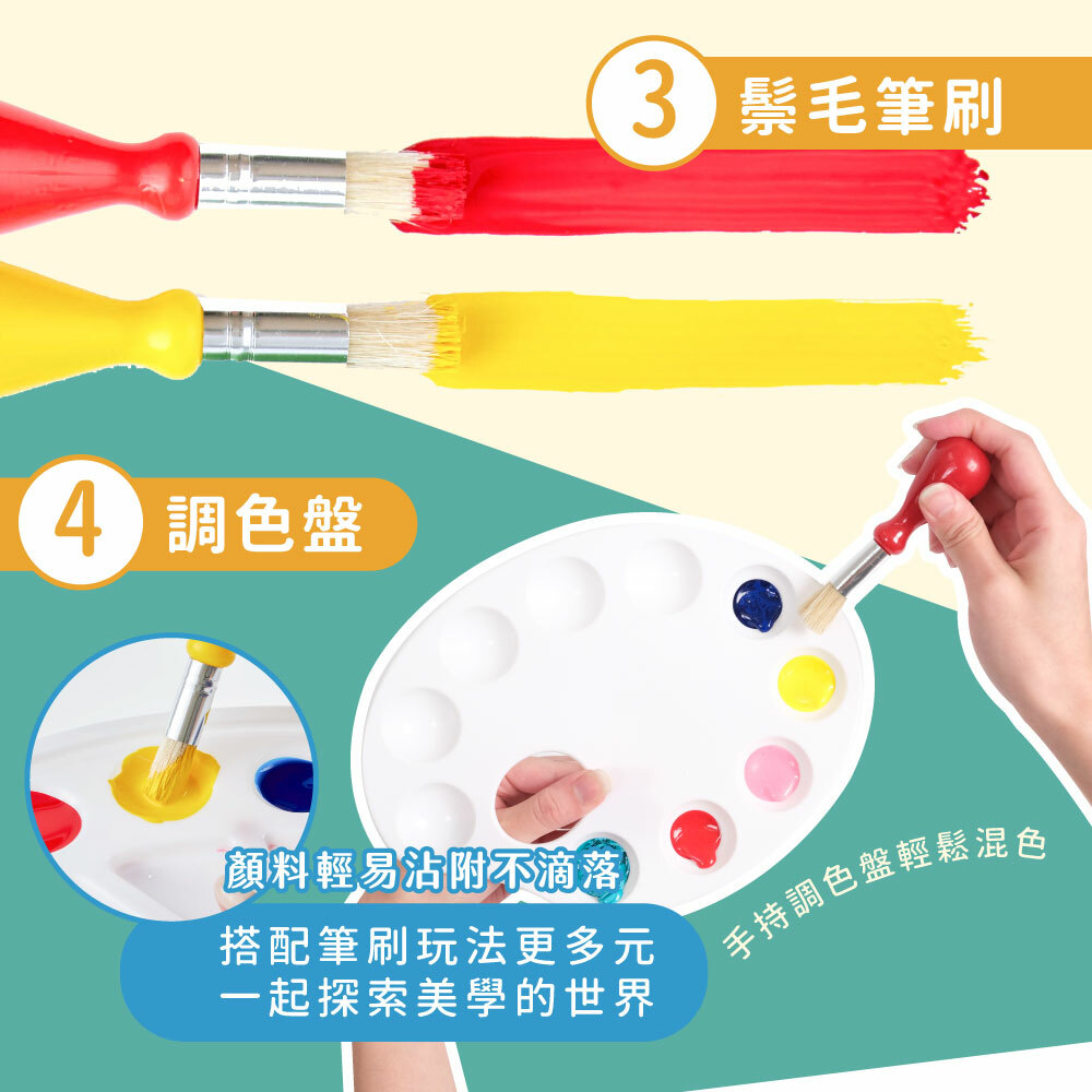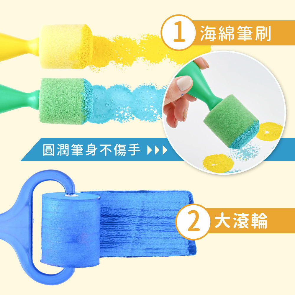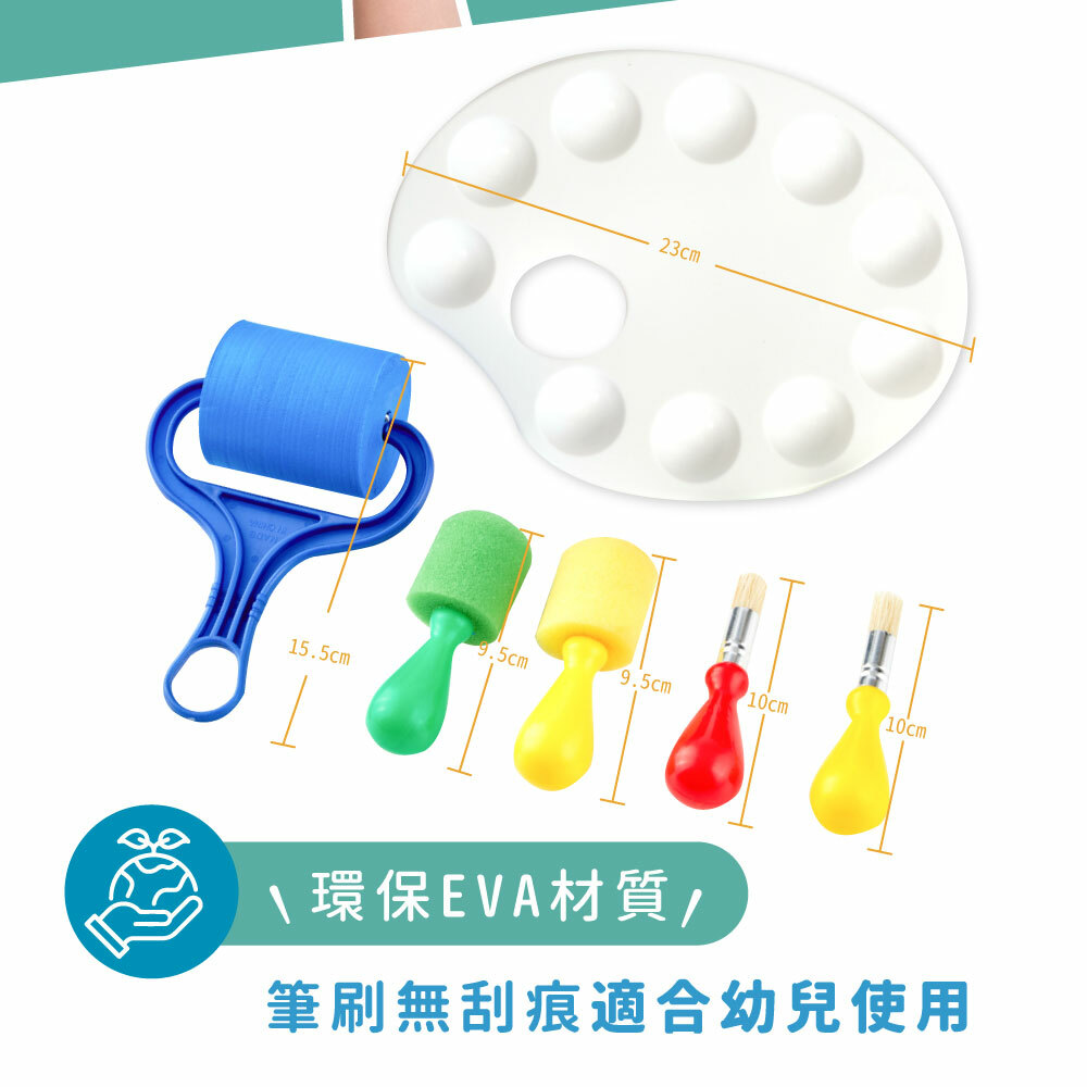 特 點:環保EVA材質,筆刷無刮痕適合幼兒使用,多種工具可因應各種創作方式