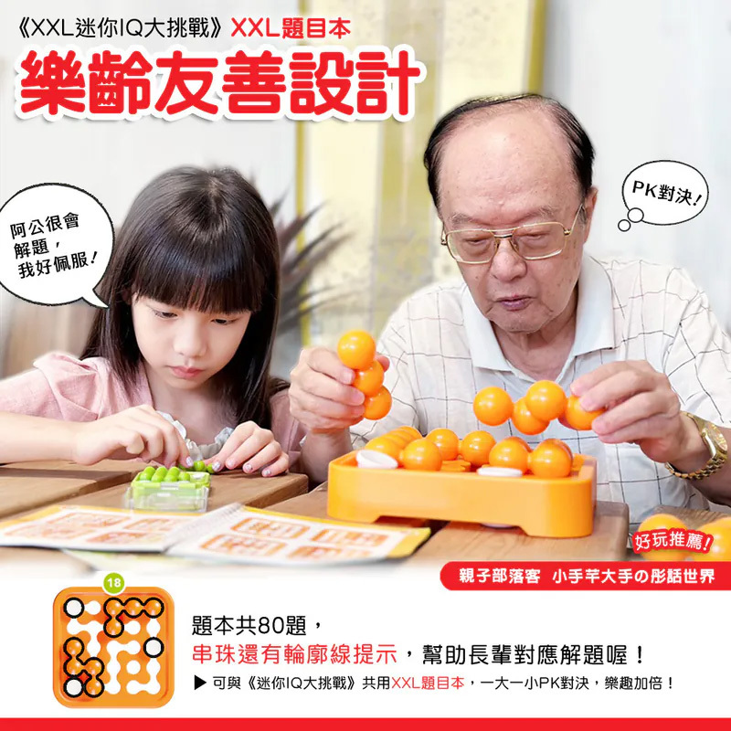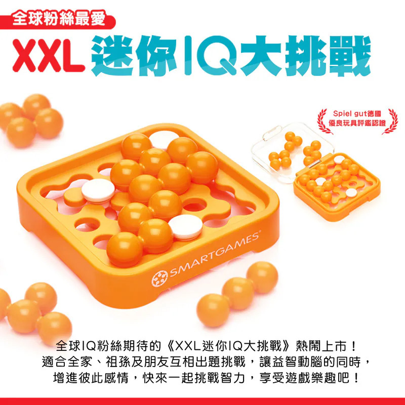 全球IQ粉絲引頸期待,放大版的《迷你IQ大挑戰》-《XXL 迷你IQ大挑戰》終於熱鬧上市,適合全家、祖孫及朋友互相出題挑戰,讓益智動腦的同時,增進彼此感情,快來一起挑戰智力,享受遊戲樂趣吧!