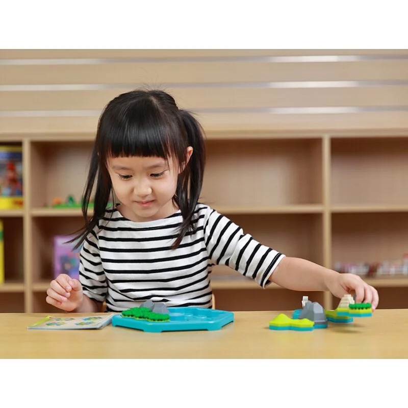 四連方六角形蜂巢拼板設計,可以轉動改變拼板形狀,每個拼板都可以變化出4種不同的形狀。遊戲時,可以依據地圖線索改變海洋、叢林、小山與岩山的相對位置,配搭被叢林與岩石包圍的失落神廟,讓遊戲更具豐富性與變化性。80個遊戲關卡,由淺入深,增進策略規劃與解決問題能力,提升專注力與空間概念。