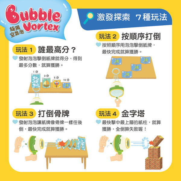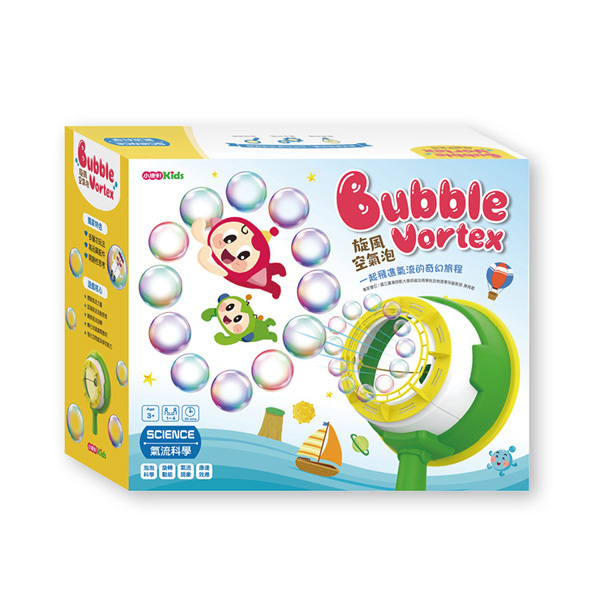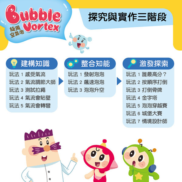 說明書X1、知識繪本X1、旋風空氣泡X1、泡泡盤X1個、泡泡水X6、任務卡X4、造型束口袋X1