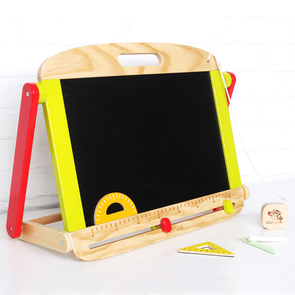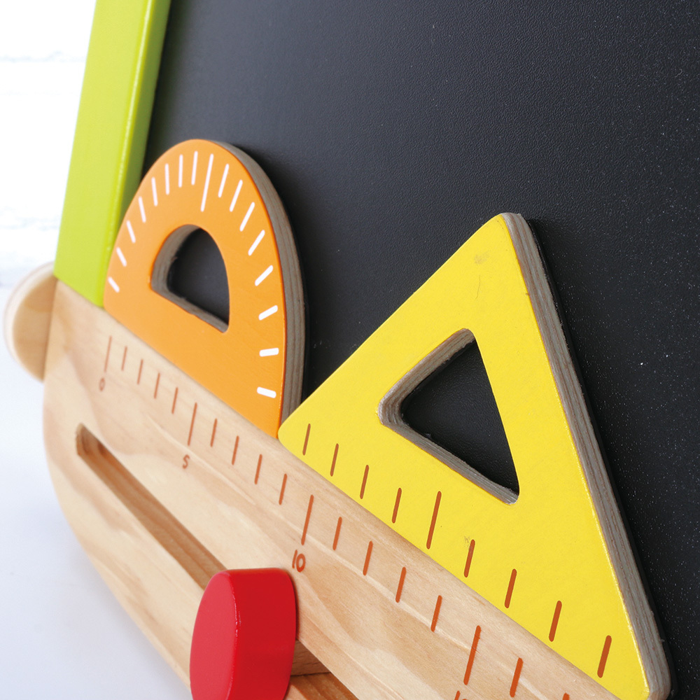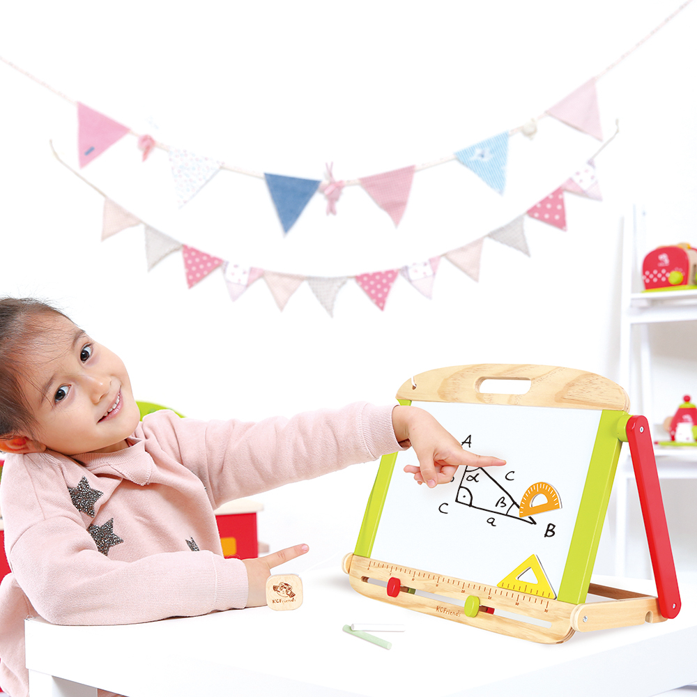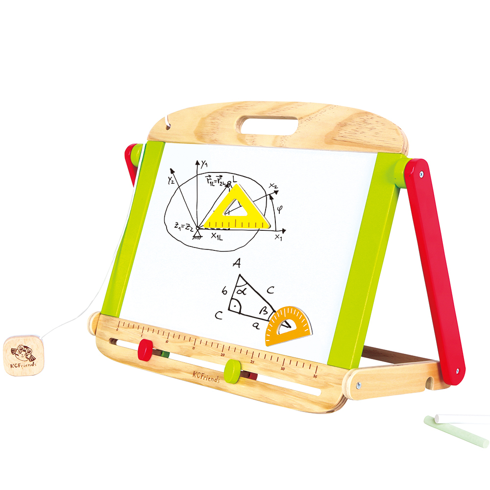 黑白版雙面功能、可穩固放置於桌面上。版面傾斜角度符合人體工學,保持優良姿勢。配件有磁鐵、板擦,及雙色環保粉筆。
